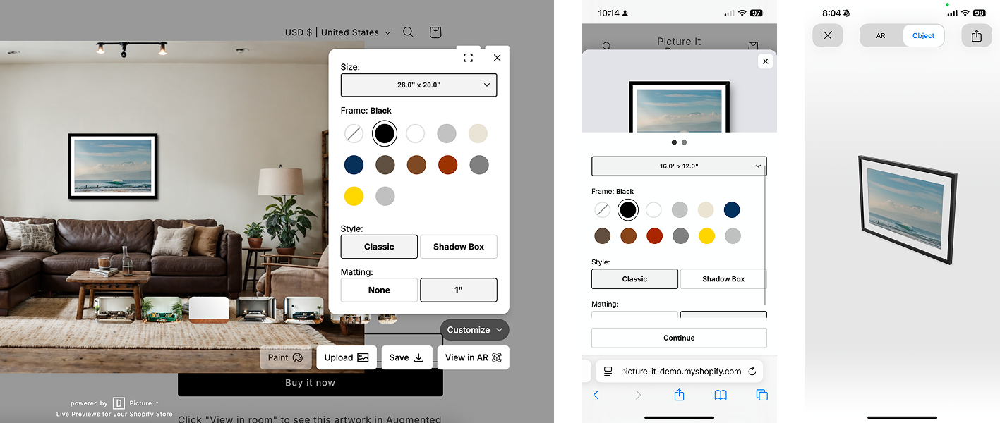 Auto-Framing lets you take your product image and automatically place it into a 3D product with frames. This means your product's main parent image (which you can customize) will be used, your variant's dimensions will be imported, and your customers can select how to display those with frames of your choosing.